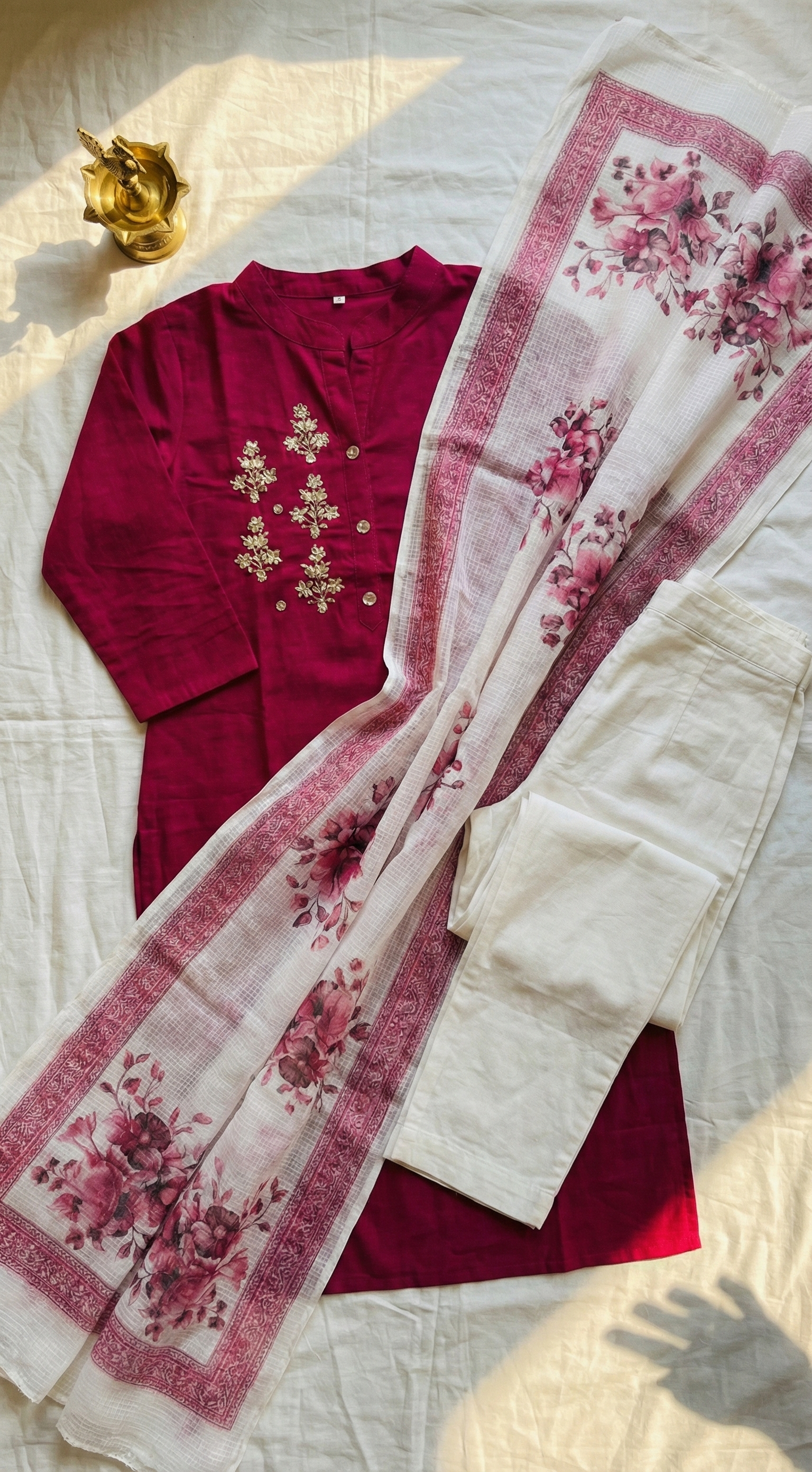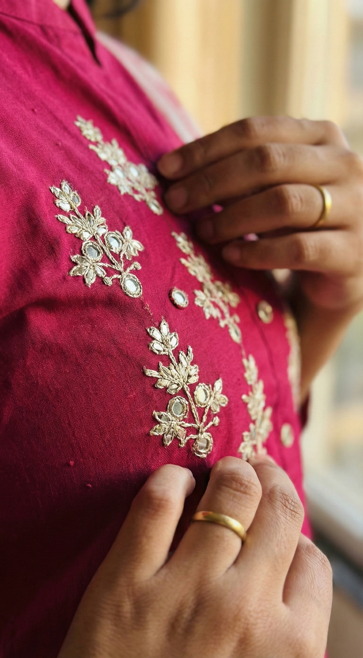This wine red vichitr set is for the woman who knows that true style is in the details. The hand-embroidered cut dana and moti work—delicate floral vines running down the placket—feels personal, like something passed down. The kind of outfit you reach for when you want to feel special but grounded.