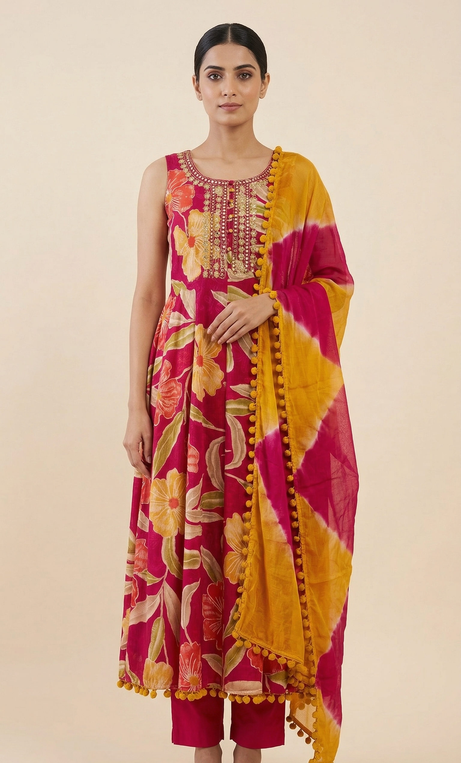 The kurta features a sleeveless design, perfect for warm weather and contemporary styling. The highlight lies in the beautifully detailed neckline with intricate embellishment, adding a touch of richness to the vibrant floral print base. The lively pink tone combined with oversized floral motifs creates a fresh, youthful aesthetic.