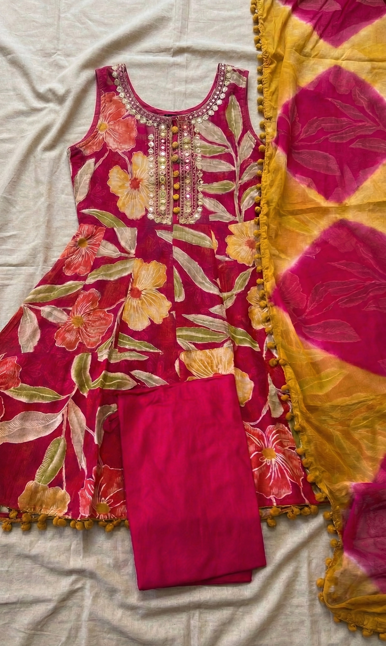 Paired with coordinated straight-fit pants, the outfit ensures both comfort and structure. Completing the ensemble is a stunning dual-shade chiffon dupatta, featuring a tie-dye effect in pink and mustard hues, finished with delicate pom-pom lace detailing along the borders—adding a playful yet festive touch.